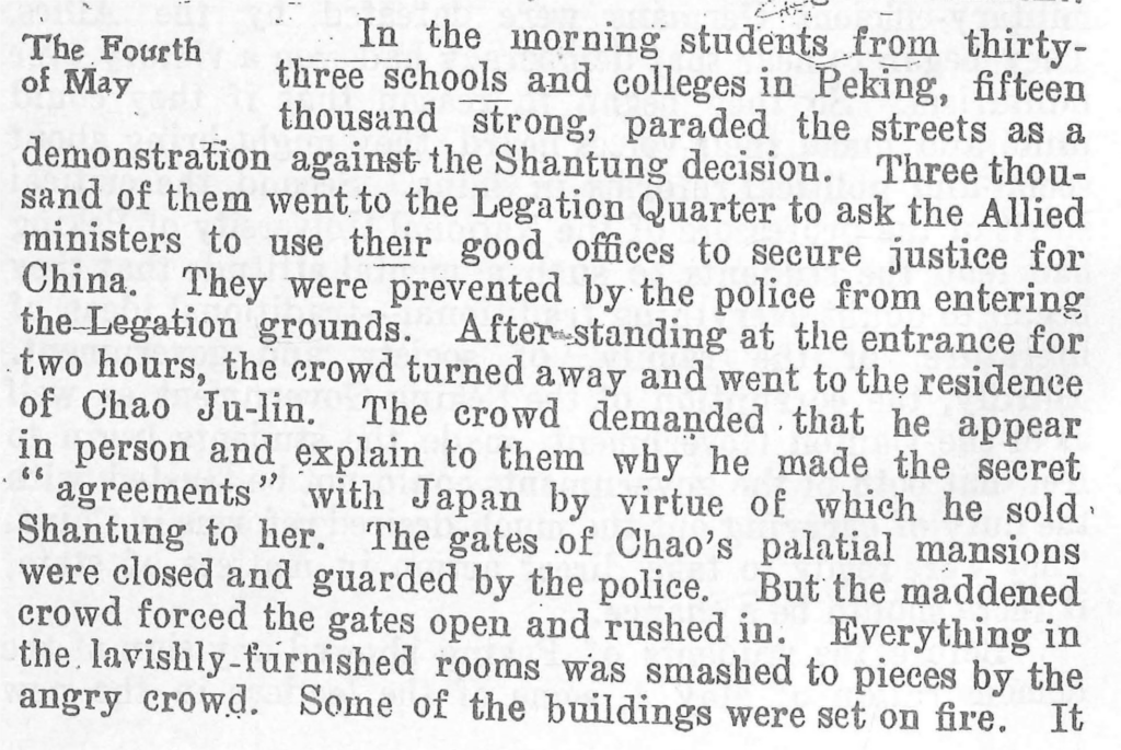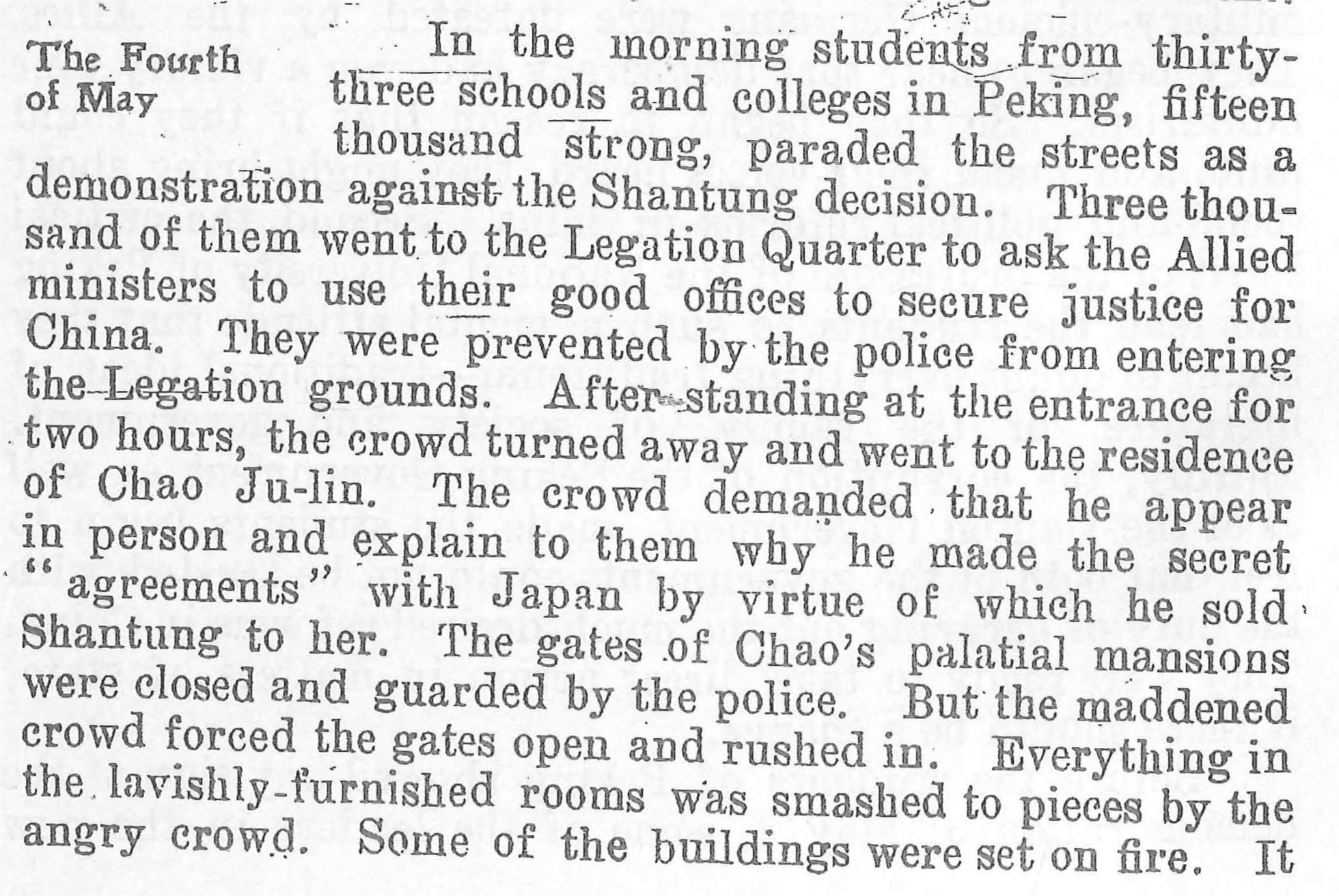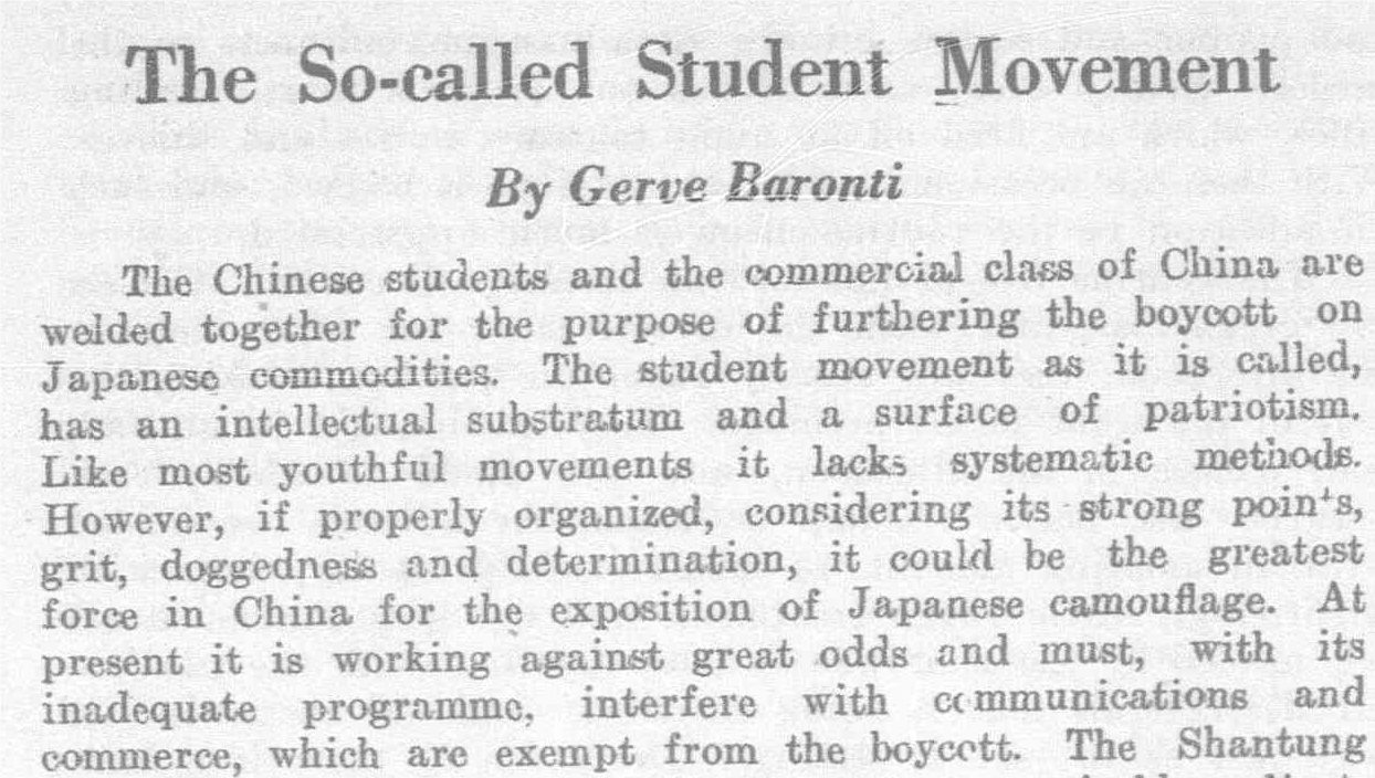 In a piece entitled “The So-called Student Movement,” published in 1920 in The Far Eastern Review, Gerve Baronti wrote of the May Fourth Movement:
