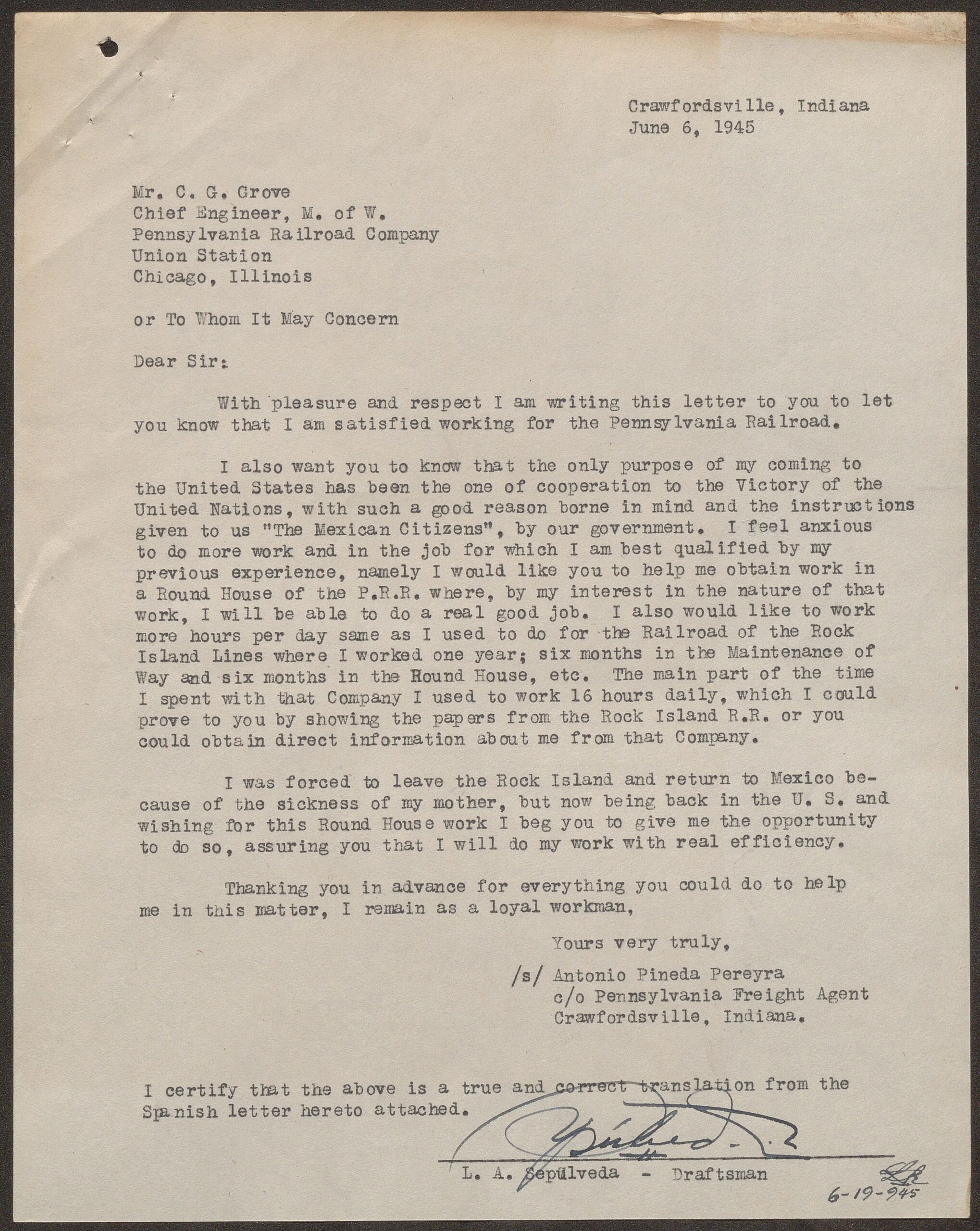 From the Hagley Library, Wilmington, Delaware, we have the Mexican Employment Files (1944-1946). This collection covers the Pennsylvania Railroad’s involvement in the Bracero Programme. The files include dossiers on individual Mexican workers and correspondence relating to the administration of the programme, which was a joint effort of the railroad industry and the American and Mexican governments.