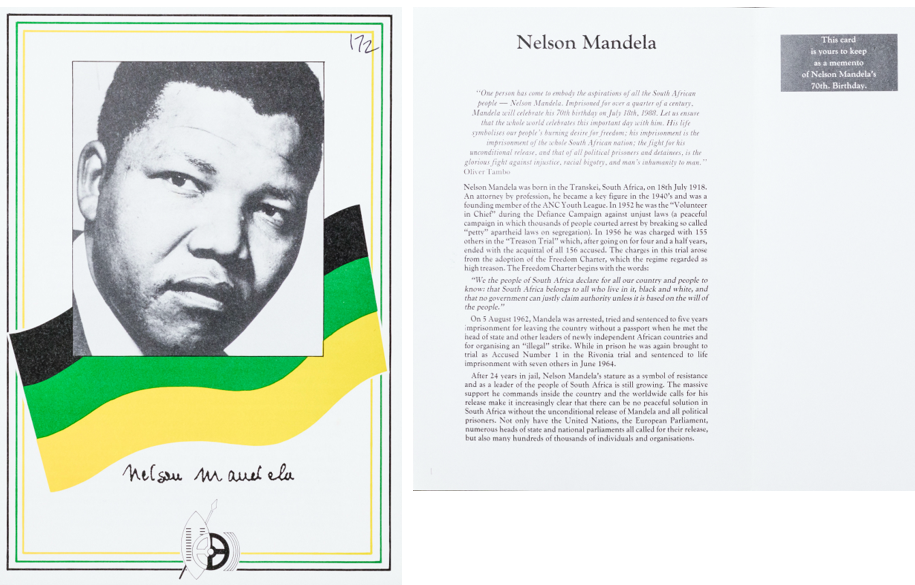 The above is a birthday card that was created and distributed by the ANC to celebrate Nelson Madela’s 70th birthday and continue the momentum in the campaign to have him released from prison.