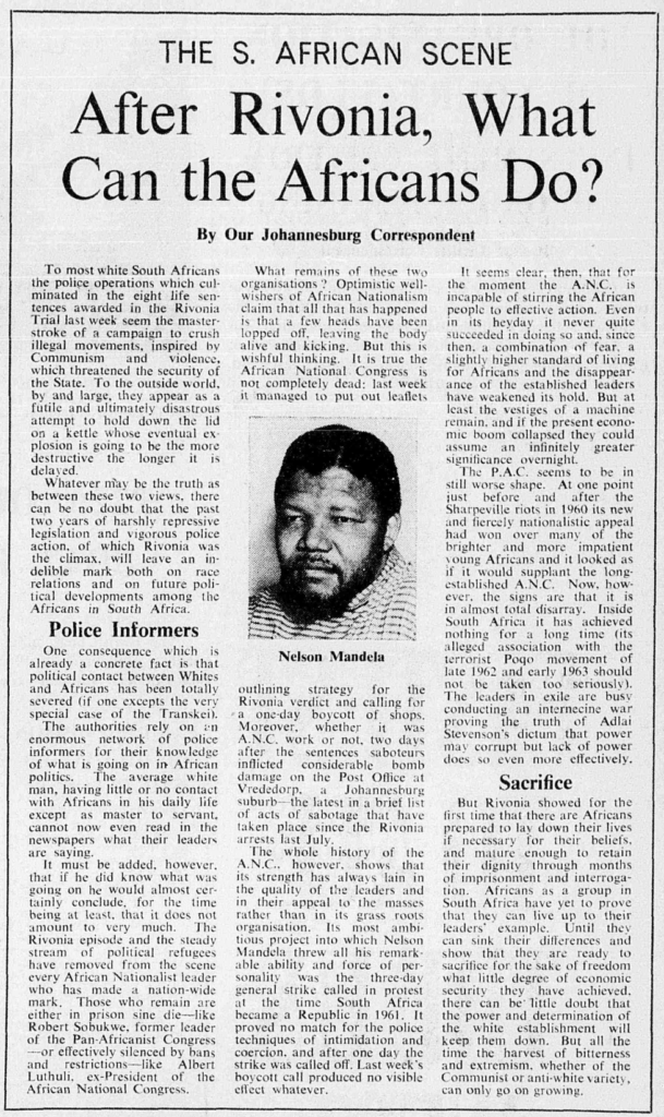 The article above strongly reflects mainstream western views on racial tension in South Africa in the immediate aftermath of the infamous Rivonia Trial where Nelson Mandela and several of his colleagues in the African National Congress (ANC) were sentenced to life imprisonment.