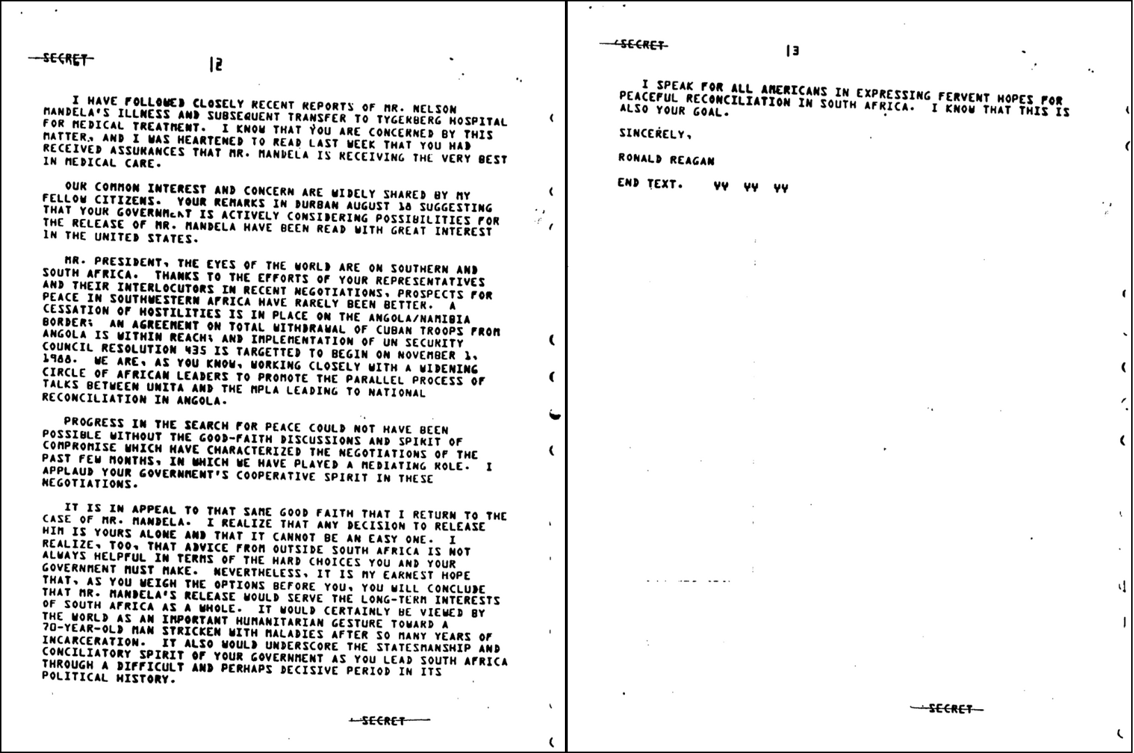 This letter from American President, Ronald Reagan, to PW Botha, the South African President, contains a variety of geopolitical insights from the late 1980s, as well as a strong example of how to appeal to the better angels of an interlocutor’s nature. In part, it also indicates how President Reagan’s regard for Nelson Mandela evolved over time.