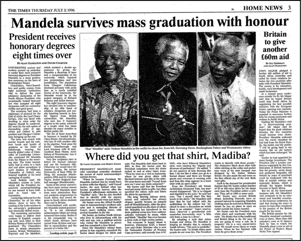 We move from newspaper articles about Mandela’s imprisonment and struggle for freedom to articles about his fashion sense and style as “world statesmanship’s nattiest dresser”. A fantastic contrast in every respect.