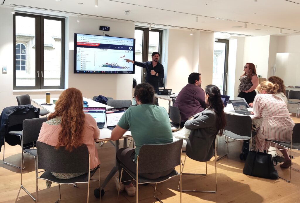 In each track, attendees received a brief introduction to the workflow of Gale Digital Scholar Lab before being placed into their groups and encouraged to begin exploring. Groups chose their project from a pre-arranged list of topics, each of which had an associated sample dataset that could be downloaded from within the Lab. These pre-made datasets took the onus off the groups to find and collate their own content set – a process that can be lengthy, even in a platform as user-friendly and streamlined as the Lab.
