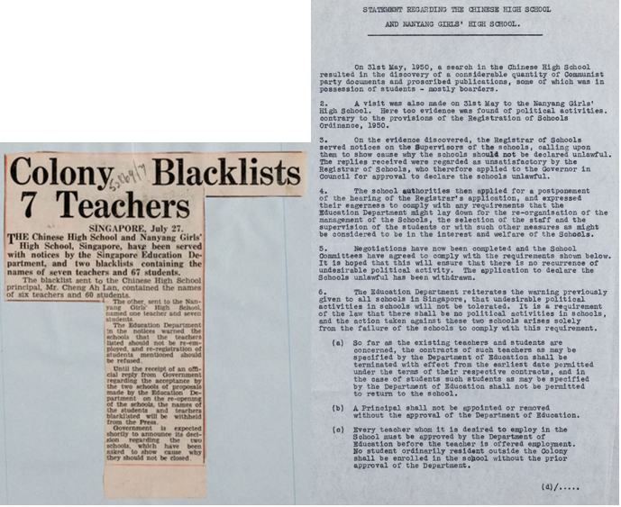 Communism also found its way to schools. Some teachers and students from the Chinese High School ( 華僑中學) and Nanyang Girls’ High School (南洋女子中學校) in Singapore were found actively involved in communist activities. Here is a page from the statement issued by the Colonial Government of Singapore regarding communist activities in the two schools.