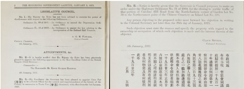 Here are two pages from the Hong Kong Government Gazette from January 5, 1923. Notices concerning Chinese residents sometimes are released in both English and Chinese. Here is one such notice on the closing of a section of road in the city that may affect the Chinese cemetery.