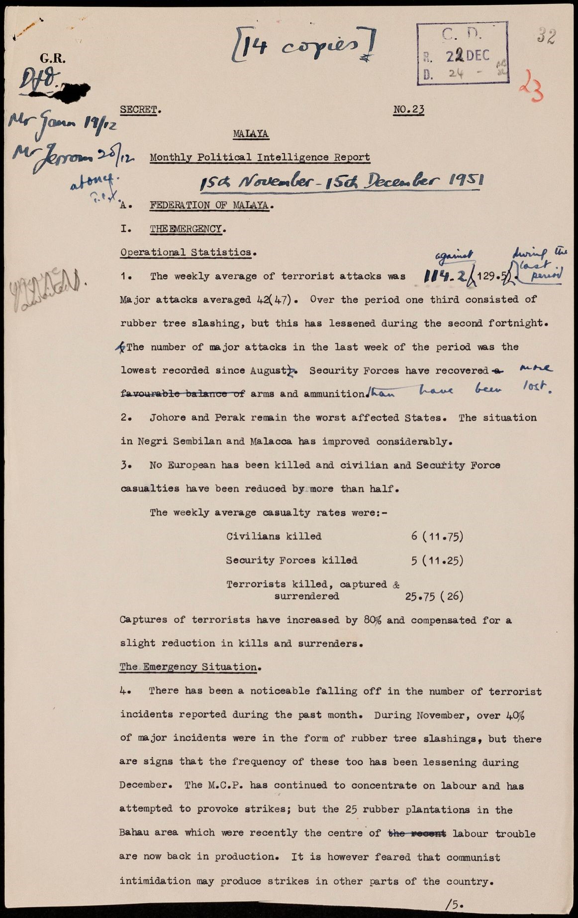 Below is a page from a monthly political intelligence report on the emergency situation during Nov-Dec 1951, describing the number and form of attacks and casualties caused.