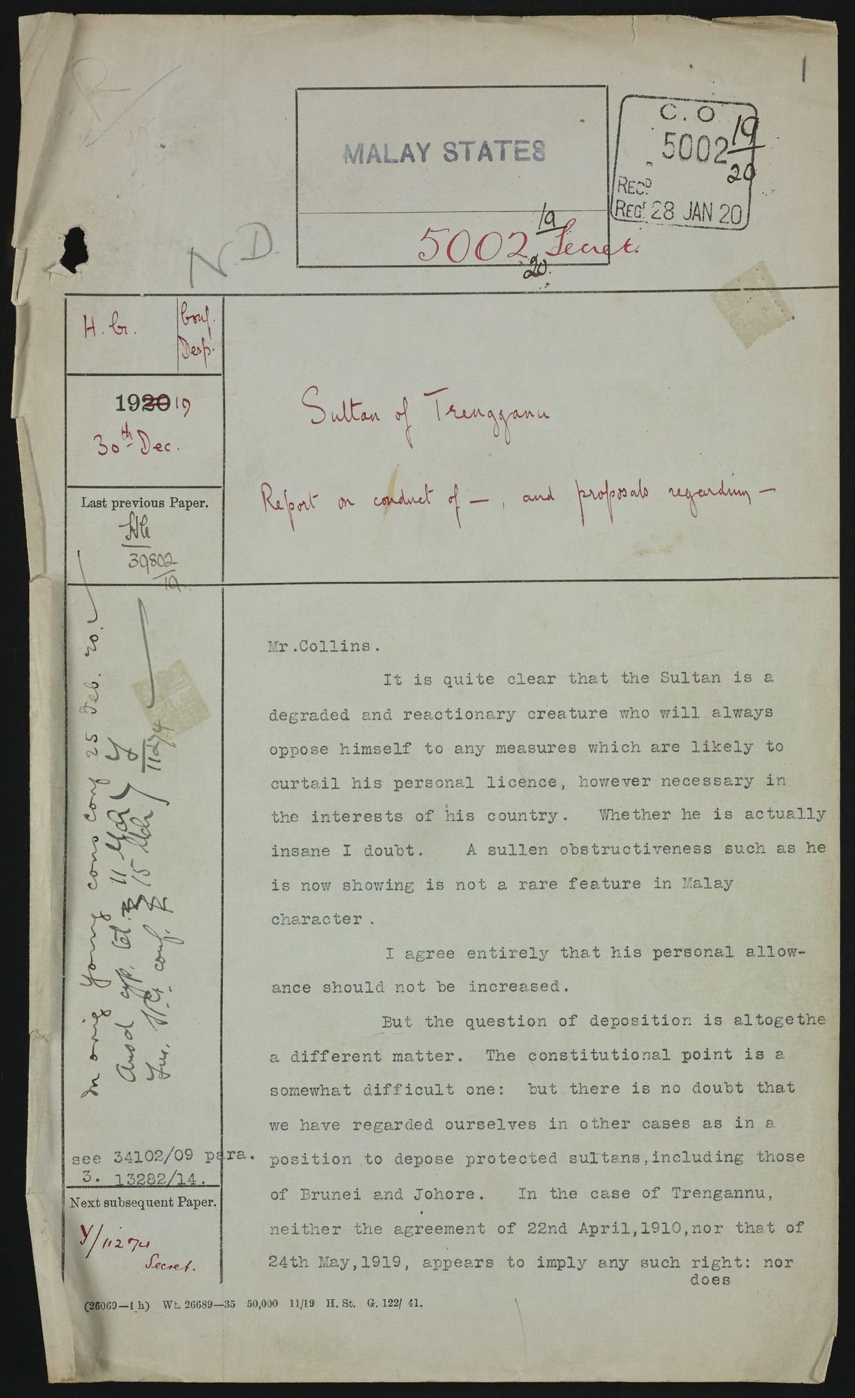 CO 537 contains many volumes on the activities of these sultans. Sultan Muhammad II (1919-1920) of Terengganu was described in a report of December 30, 1919 by the British high commissioner as a “degraded and reactionary creature” and would not recommend increasing his allowance. At the same time, the report also discussed the possibility of deposing/removing the Sultan, which transpired in 1920 when he was forced to abdicate.