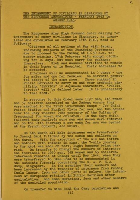 CO 537/1220 includes a document titled “The Internment of Civilians by the Nipponese Authorities Feb 1942-Aug 1945.” It was compiled by C. E. Courtenay from camp records. Shortly after the fall of Singapore, the Japanese army command issued an order on the internment of “enemy civilians”. Thousands of civilians were first captured and put in internment camps across the island before being moved to the notorious Changi Gaol.
