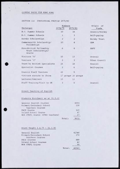 The 24 volumes of registered files include among others quarterly and annual reports, management reports, and country briefs, covering the council’s policy, budgets, and activities organized. Included in the country brief for 1979 is a statistical profile that lists the various activities organised or initiated by the council in Hong Kong, such as summer schools, fellowships and grants, courses, lectures and seminars.