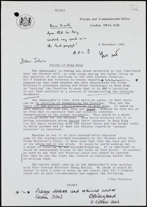 Given the increasing defence costs and the expiry of the lease of the New Territories, the British government realised it had to engage in talks with the PRC. The Prime Minister’s Office archive contains more than 30 subject files with the same title of “Future of Hong Kong” produced between 1982 and 1997 providing an archival record of the protracted bilateral negotiations.