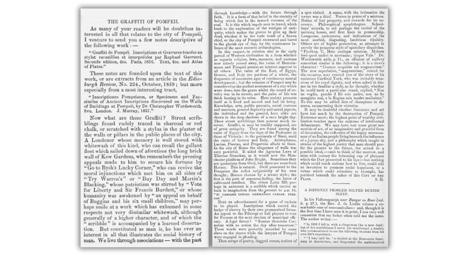 Studying historical graffiti helps us build and weave together multiple narratives of the past, enriching our understanding of the people that lived during the time. Because it was easily accessible for people to leave their mark, and they could do so anonymously, we’re left with authentic thoughts and emotions, both big and small. We also see ourselves, regardless of how modern, with some of the same curiosities, impulses, and ambitions.