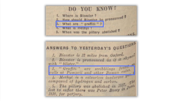 Even though graffiti has existed as long as people have been making marks on things, the term “graffiti” was only adopted into the English language in the middle of the nineteenth century. In 1921, The Nottingham Evening Post featured the somewhat niche technical term in their daily trivia section, “Do You Know?”. The question asked readers, “What are ‘graffiti’?”. The correct answer was: “‘Graffiti’ are scribblings found on walls at Pompeii and other Roman ruins.”