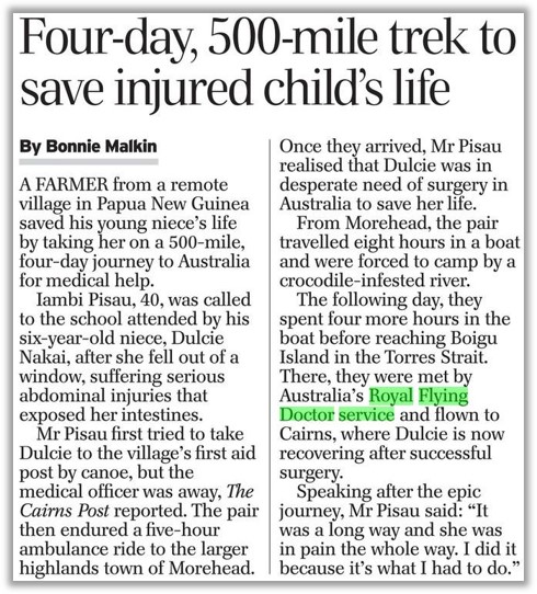 The RFDS has also helped other Pacific communities in times of need. In 2009 a young girl from Papua New Guinea was in desperate need of emergency medical treatment. Her journey began with a five-hour ambulance ride, followed by two boat trips totaling 12 hours, before arriving in the Torres Strait Islands where she was met by the RFDS and flown onto Cairns Base Hospital for life-saving surgery.