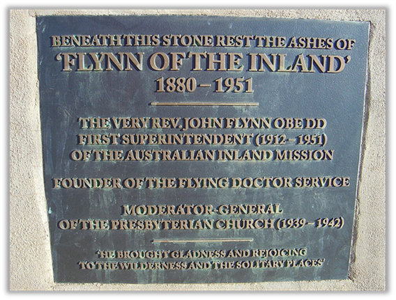 John Flynn died in 1951 and in recognition of his outstanding service to Australia he has suburbs named after him in Canberra and Alice Springs, a Uniting Church, and a private hospital. He also features on the Australian twenty-dollar note. As stated on his memorial plaque “He brought gladness and rejoicing to the wilderness and the solitary places” and was known as “Flynn of the Inland”.