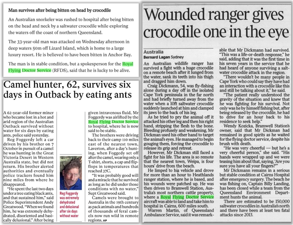 Australia and the Northern Territory are known for their dangerous wildlife, including the infamous crocodiles, however the RFDS stands ready to respond to any medical emergency. In 2019, The Times reported that Craig Dickman had been flyfishing at Cape York Peninsula in the most northern point of mainland Australia when he was attacked by a crocodile and narrowly escaped by gouging its eyes. Craig drove to a ranger station where his leg wound was patched up and he was transported by the RFDS to Cairns for life saving treatment.