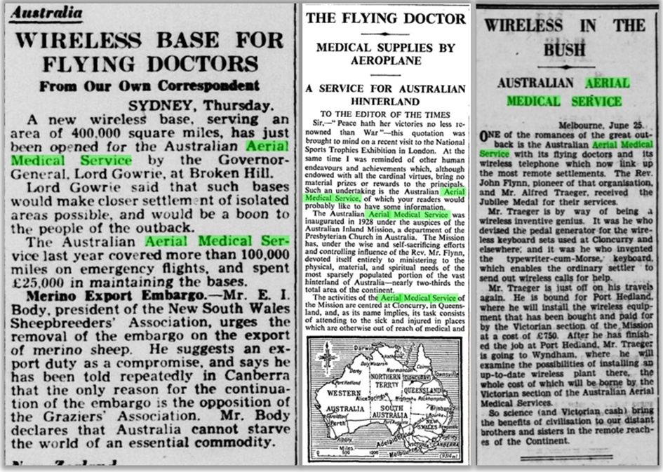 Reports on the flying doctor service appear in a wide range of publications from all over the world. An article in the Malay Mail from 1936 describes the importance of the bicycle pedal powered radio transmitters and the morse code symbol keyboard they utilised – there were over 30 pedal-operated sets in use at the time. The Nursing Times called the nursing sisters of the Australian Aerial Medical Service “the heroines of Australia”.