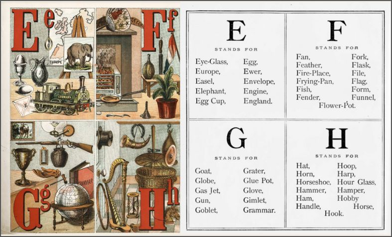 New illustration styles developed and were an important way to engage young readers. Aunt Louisa’s Alphabet presented items in a seek and find style, similar to the I Spy books we see today.