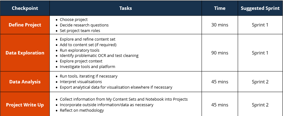 From the beginning, we used hackathon ‘sprints’ – discreet periods of time where teams work on their project. At Hacking History Coventry, we added ‘checkpoints’ to provide further structure for attendees, the majority of whom had never attended a hackathon before.