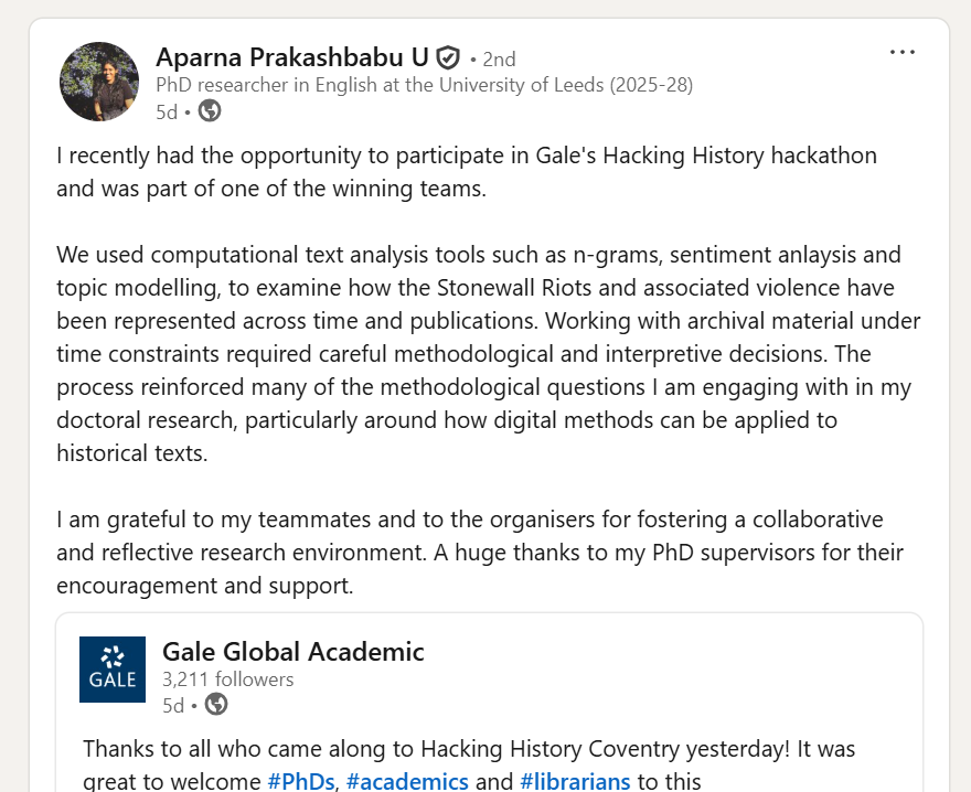 Positive feedback for Hacking History Coventry shared on LinkedIn. Included with permission from Aparna Prakashbabu.