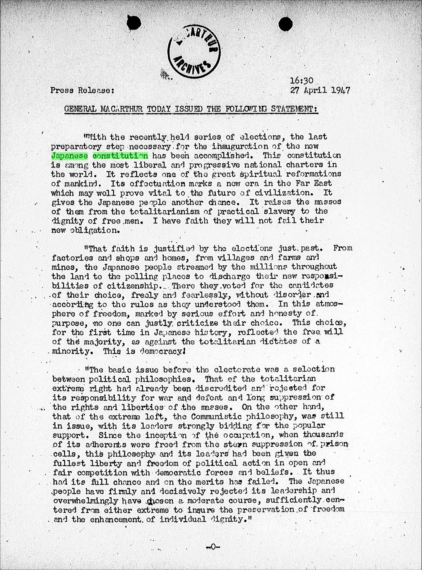 With the surrender of the Japanese on September 2, 1945, General MacArthur assumed his authority as Supreme Commander for the Allied Powers (SCAP). Unlike historical occupation commanders, MacArthur took a benevolent approach toward the Japanese and personally oversaw the rebuilding and democratisation of Japan. An early equitable peace treaty with Japan was a major goal. A new constitution, a radical departure from Japan’s prewar constitution, was readied in months.