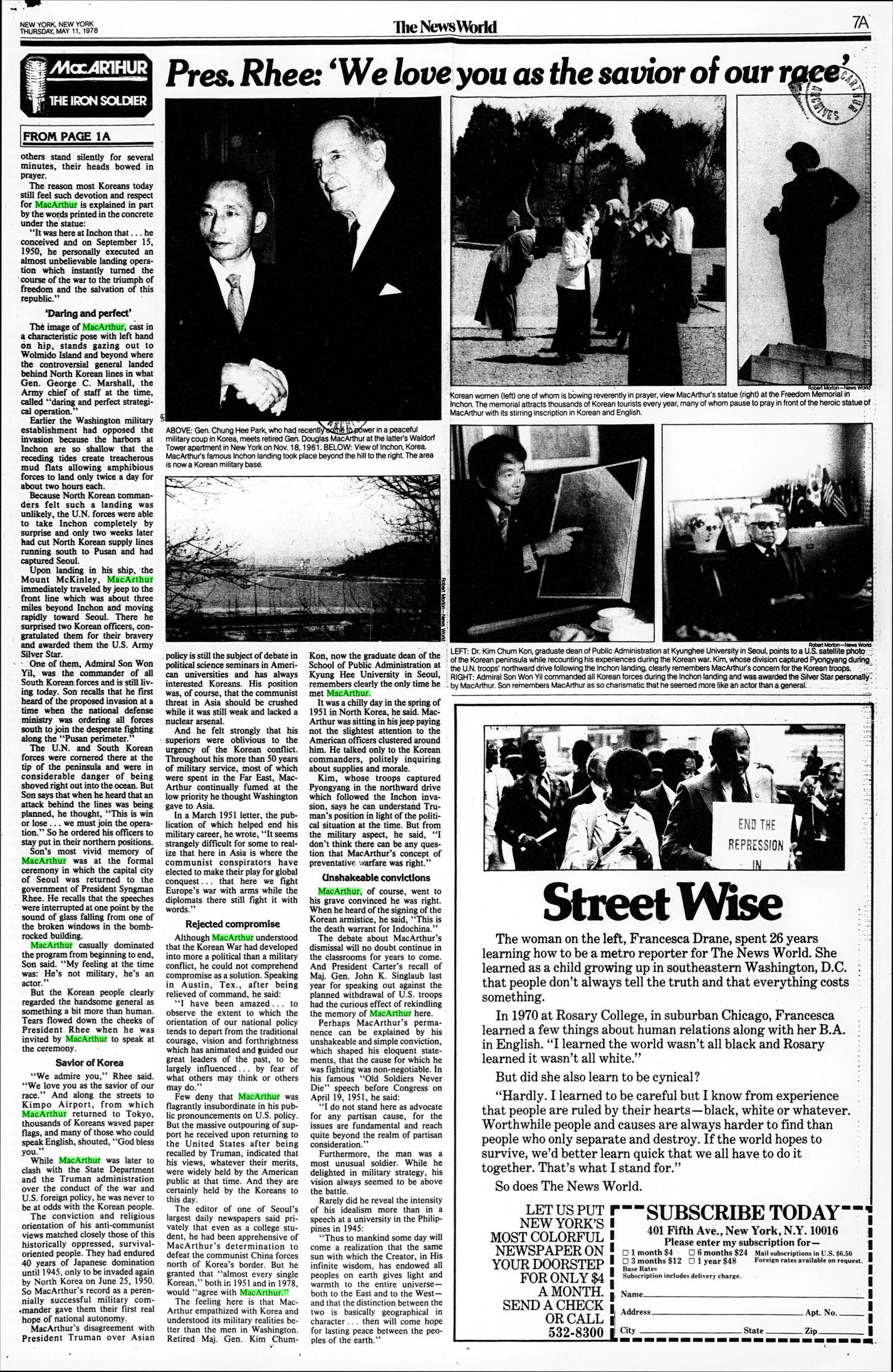 He is also regarded in South Korea. On September 29, 1950, as the South Korean government returned to Seoul, President Syngman Rhee told him, “We love you as the saviour of our race.” Yet not all in Japan or Korea welcomed U.S. occupation or the long term American military presence.