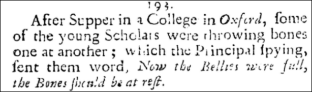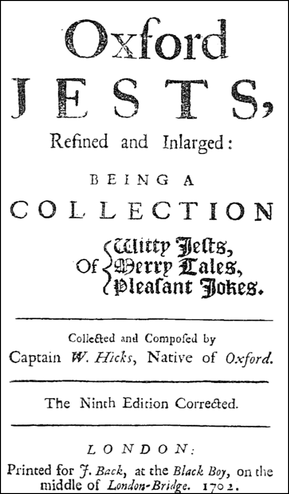 A number of joke-books specifically attributed to students were popular in England. One book in particular, Oxford Jests, Refined and Inlarged: Being of a Collection of Witty Jests, Merry Tales, Pleasant Jokes was published a number of times in London – suggesting a popularity outside of the university towns. But what was so funny in these universities? Some examples demonstrate little more than the long history of bad puns: